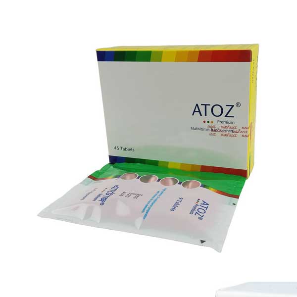 Atoz Premium is indicated for the prevention and treatment of vitamins & minerals deficiencies. As a complete daily nutritional supplement, it is also indicated to meet the increased demand for vitamins and minerals in the conditions like physical and emotional stress, chronic diseases, infection illness, osteoporosis, injuries or wound, surgery, poor digestion, old age, pregnancy and lactation, poor appetite, excess dieting, exposure to environmental pollution, heavy exercise etc.