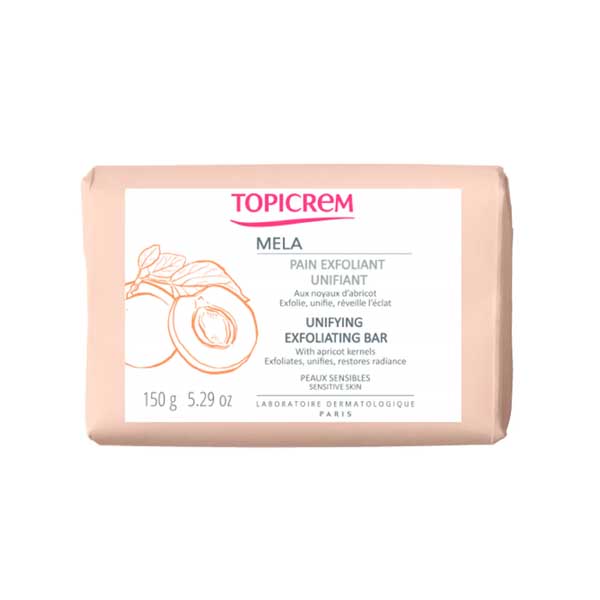 Topicrem Mela Unifying Exfoliating Bar kernel granules, gently smoothes the skin of the face and body and therefore reduces pigment spots .